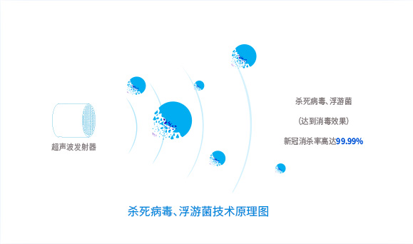 利用超声波物理作用在空气媒质中传播高频耦合性疏密媒介振动,带动气溶胶进行高速耦合运动。靠强烈的加速度往复运动可以对气溶胶中的新冠病毒和耦合微生物产生撕裂效应,使微生物细胞及内容物、病毒RNA链受到强烈的震荡断裂,从而达到对微生物灭活的效应。